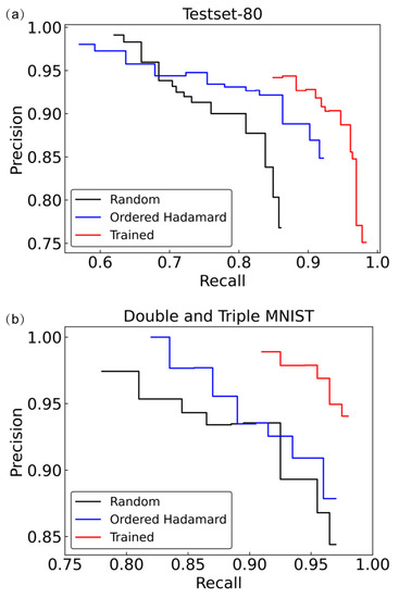 The precision–recall curves of SP-ILC tested on (a) Testset-80 and (b) double and triple MNIST dataset for different kinds of patterns.