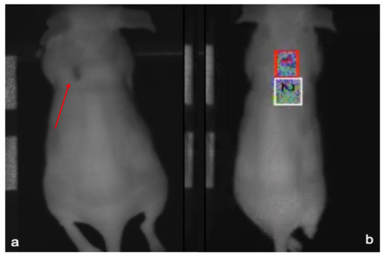 To assess vascular perfusion in tissues, laser Doppler flow was performed as described previously [25]. Briefly, a Flolab flowmeter with MP13 probe (Moor Instruments Ltd., Axminster, Devon, UK), equipped with a 1 mW laser emitting at 780 nm at 15 Hz, was used 4 cm above the mouse skin. The MP13 is a noncontact probe that avoids flow alterations due to mechanical contact with the mouse skin. The LDF laser output power was validated using a calibrated detector (Laser Check, Coherent, Santa Clara, CA, USA). The LDF output signal is named Flux (F) or Perfusion and denoted in arbitrary units (a.u.). Analysis was performed for 1 min at two selected square sites (2 × 2 cm each) on the skin at radionecrosis, and a healthy site located immediately caudal to the above site (Figure 1). Animals were acclimatized to room conditions at 22 °C for 10 min prior to assessments, and weekly imaging was performed at the same time of day to reduce metabolic or circadian variations.