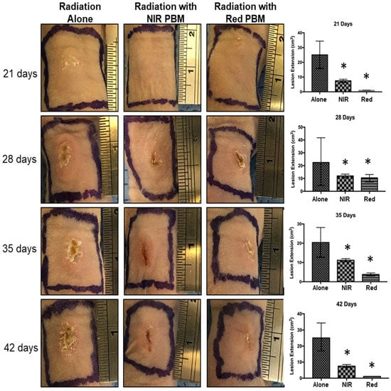 Wound images from representative animal groups over time after 125I brachytherapy and PBM treatments at 21, 28, 35, and 42 days Digital quantitation of lesions is shown on the right panel as means with standard deviation; * denotes statistical significance n = 6, p < 0.05 with Kruskal–Wallis and Dunn’s test.