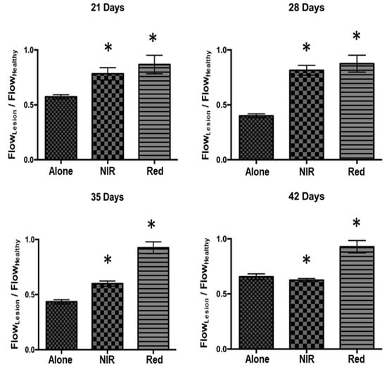Vascular perfusion in radionecrosis lesion, compared with adjacent healthy skin in radiation and PBM-treated groups at 21, 28, 35, and 42 days. Data are presented as means with standard deviation; * denotes statistical significance n = 6, p < 0.05 with Kruskal–Wallis and Dunn’s test.