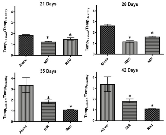 Thermal skin imaging to assess inflammation in radionecrosis lesion, compared with adjacent healthy skin in radiation and PBM-treated groups at 21, 28, 35, and 42 days. Data are presented as means with standard deviation; * denotes statistical significance n = 6, p < 0.05 with Kruskal–Wallis and Dunn’s test.