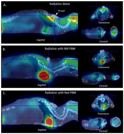 Fused images from CT and µPET to examine metabolic changes in radiation alone (A), NIR PBM treated radiation group (B), and red PBM treated radiation group (C). The 125I seed is shown as a radiopaque, while the areas of 18F-FDG uptake are outlined in areas below the seed with a red dotted line.