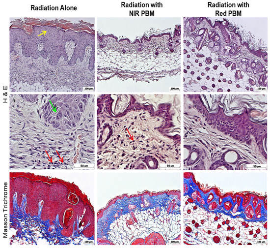 Histological analysis with H&E and Masson Trichrome staining of skin overlying the implanted 125I seed at 42 days. The left panel shows tissues from the radiation alone, the middle depicts the radiation with NIR treatments, and the right panel shows radiation with red PBM-treated group. The yellow arrows highlight the hyperkeratotic regions with mitotic figures (green arrow), indicating cell proliferation in the spinous zone. The red arrows highlight the inflammatory cells infiltrating the connective tissue.
