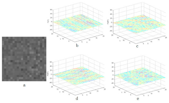 Second-order derivative characteristics of flat background in four directions: (a) the flat background and (b–e) the three-dimensional distribution of flat background.