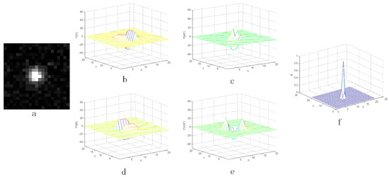 The result with the noise whose coefficient Q is 1%: (a) the star image with added random noise and (b–e) the three-dimensional distribution of the second-order derivative, (f) the output value after CMLCM processing.