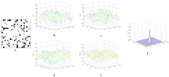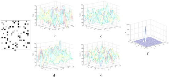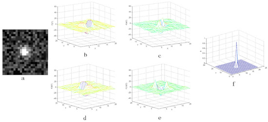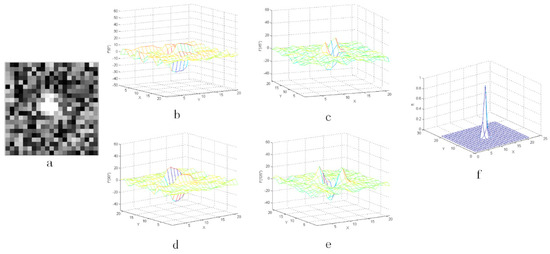 The result with the noise whose coefficient Q is 80%: (a) the star image with added random noise and (b–e) the three-dimensional distribution of the second-order derivative, (f) the output value after CMLCM processing.