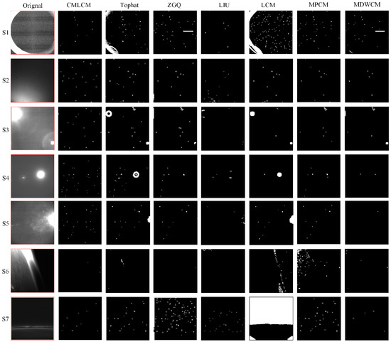 Secondly, the CMLCM was applied to analyze the real image sequences. There were seven real star image sequences (S1–S7) in the experiments. The sequences were the actual star images taken by several models of star sensors in high and low orbits. There was single-pixel noise, moonlight interference, sunlight interference, or earth-atmosphere light interference in the star images. Sequence S1 was the condition when light leaked around the hood, S2 to S5 were the conditions when sunlight and moonlight enter into the field of view, S6 and S7 were the conditions when earth-atmosphere light entered into the field of view. S1 to S7 can actually cover most conditions of complex backgrounds. The proposed CMLCM algorithm was compared with other algorithms, such as TOPHAT [7], ZGQ [14], LIU [11], LCM [16], MPCM [18], and MDWCM [19].
