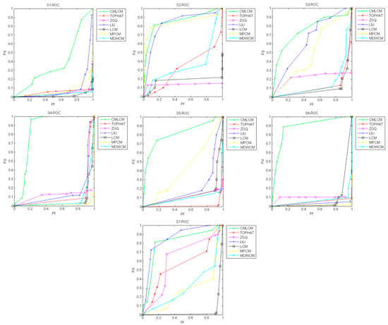 As shown in Figure 14, the ROC curve was calculated for the S1–S7 sequences. In the figure, Pd represents the detection rate ( in Equation (18)) and Pf represents the false alarm rate ( in Equation (18)). A comparison of the algorithms shows that the detection rate of the CMLCM algorithm was higher than the other algorithms when the false alarm rate was the same in most situations. Considering that a star sensor does not need to extract all the stars in the matching process, it could generally achieve perfect matching and attitude measurement with eight to nine correct stars. Therefore, when the ultimate detection rate was not pursued, the CMLCM algorithm could ensure a lower false alarm rate to weaken the effect of false stars in the matching process.