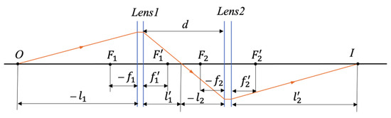 In this figure, and are the object distance and the imaging distance, respectively. and are the front focal length and the back focal length of the lens. is the distance between the two lenses, and the lens thickness is ignored. Subscript shows the lens number.