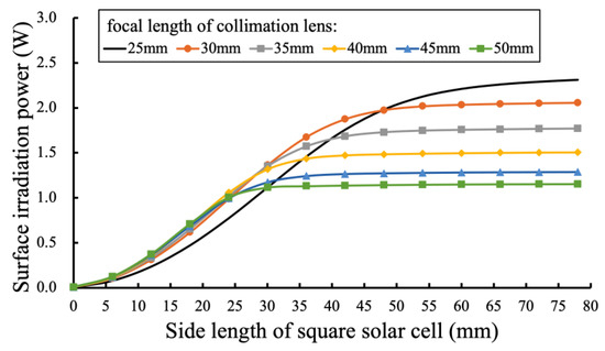 In the collimation scheme, a collimation lens with a longer focal length causes beam leakage more critically under the same lens aperture conditions. On the other hand, a shorter focal length increases the irradiation spot size and leads to power loss. Thus, the surface irradiation and the focal length of the collimation lens are in a tradeoff relationship. For exploring the optimal parameters of the collimation lens, the relationship between the receiver surface irradiation and focal lengths of collimation lenses is analyzed by the simulation. The number of LEDs is assumed to be three, and the same near-infrared LEDs (OSRAM SFH4703AS) are arranged as an equilateral triangle shape with a 50 mm side length. The aperture and focal length of one imaging lens remains as 110 mm and 1000 mm, and the transmission distance is equal to the imaging lens focal length. In the optical simulation, the LED model document is provided by the simulation library of the company OSRAM. The focal length, aperture, and placement of each lens are inserted in the non-sequential mode. Three collimation lenses’ aperture diameters are maintained as 50 mm, and their focal lengths are changed from 25 mm to 50 mm. The surface irradiation results on variable receiver areas are organized and shown in Figure 5.