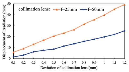 This displacement phenomenon is more apparent for the collimation lens with a short focal length. In the verification, the central place of a collimation lens deviated from 0.1 mm to 1.2 mm. Two sets of collimation lens focal lengths were applied in the simulation; the coordinate value differences of the irradiation spot are the displacement results and shown in Figure 10. In the LED-array collimation scheme, a 0.1 mm lens position deviation of an f = 25 mm collimation lens could cause a 4 mm displacement on the final irradiation. Contrastively, the same 0.1 mm deviation of an f = 50 mm collimation lens could cause a 2 mm displacement.