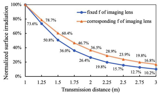 In this paper, a system was designed to obtain optimal power at a 1 m transmission distance with an f = 1 m imaging lens. With a fixed focal length of the imaging lens, a tolerance range to the different target distance was proved with a small performance deterioration [32]. On the other hand, applying different focal lengths of the imaging lens was another viable option for different transmission distances. In the case of the collimation scheme, only replacing the imaging lens with a longer focal length lens could realize the long-distance transmission. The difference between fixed and variable focal lengths of imaging lenses for longer transmission distance was explored. In a 3-LED-array configuration, three collimation lenses (d = 50 mm, f = 25 mm), an imaging lens (d = 110 mm), and a 50 × 50 mm2 solar cell were applied. The comparison results are shown in Figure 11. The blue curve with round markers shows the normalized surface irradiation by a fixed f = 1 m imaging lens. The orange curve with triangle markers shows the performance of the imaging lens f = transmission distance condition.