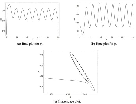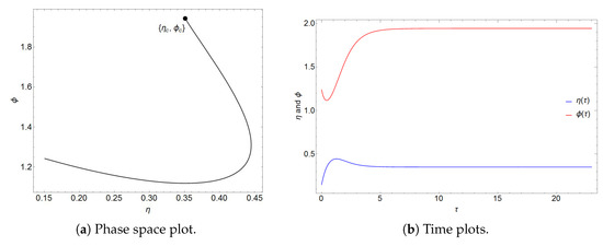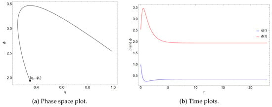 Figure 1, Figure 2 and Figure 3 show numerical simulations of the solutions of Equation (18) by choosing parameters that fulfill the conditions for the stability of the CW point. In all three solutions, the trajectories are asymptotically attracted towards the fixed point in the phase space. Additionally, it can be seen that is an ordinary attractive sink, which is consistent with the analysis from Section 3.1, where it was found that both eigenvalues are real and negative. The time plots show critically damped oscillations towards the equilibrium values and in each case.