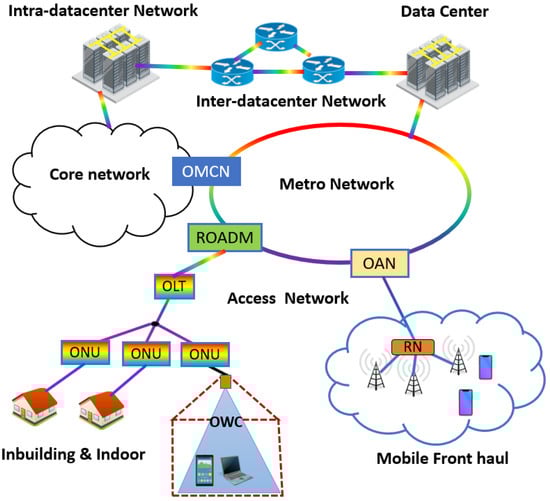 Short-reach optical communication system. OMCN: optical metro-core node, OAN: optical aggregation node, ROADM: reconfigurable optical add-drop node, ONU: optical network unit, RN: remote node, OLT: optical line termination, OWC: optical wireless communication.