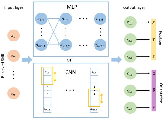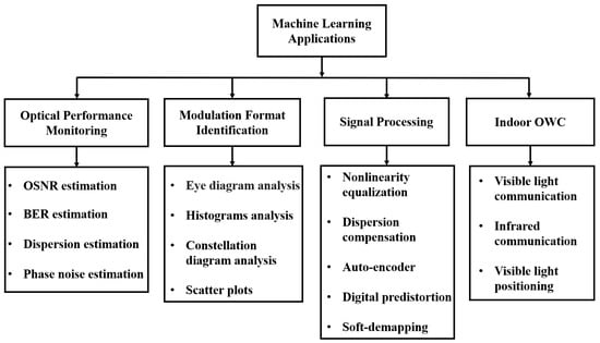 In even shorter-reach in-building/indoor OWC systems, the ML technique has also been widely studied. In both visible light communication (VLC) and near-infrared indoor OWC systems, the ML technique has been applied to improve the data transmission performance, mainly by suppressing the inter-symbol interference and nonlinear effects existing in the system [79,80]. In addition, the ML technique has also been widely applied in OWC-based in-building/indoor positioning systems, where better positioning accuracy, as well as simultaneous positioning and receiver orientation estimations, have been realized [81].