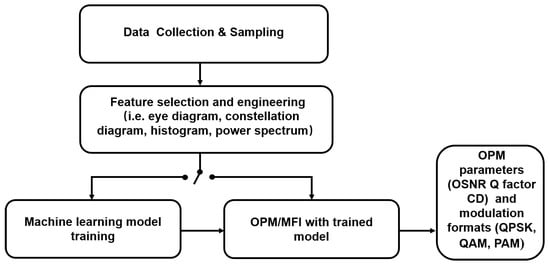 Figure 3 summarizes the generic approach for conducting OPM and MFI using ML techniques. The first step is typically creating a data set for training the deep learning algorithm. Traditionally, the optical signal is converted to the electrical domain at the receiving end and then sampled to construct a data set. Another method to obtain the data set is directly monitoring the optical signal from the transmission link, such as measuring the OSNR using an optical spectrum analyzer (OSA), which does not require optical-to-electrical conversion and can be detected online without interrupting the regular data transmission. The second step is to extract the specific characteristics of the signal, which contains information about the impairments in the system or the modulation format. The eye diagram, power spectrum, constellation diagram, and histogram are examples of such features. These features are then employed in the final step for ML algorithm training to execute OPM, or MFI [37]. Currently, the training is typically implemented offline and after training, the trained model and feature extraction steps can be used for online OPM parameters estimation and MFI. During the system or network operation, the transmission conditions and the corresponding impairments may change over time, and hence, the ML models used may need to be retrained using a newly collected training dataset [88]. Therefore, the effective retraining of ML models is also highly desirable.