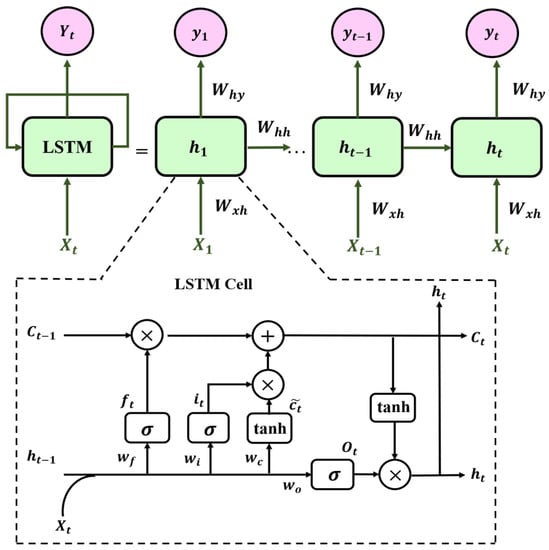 where the weight between two successive hidden states is , the weight at the input neuron is , is the activation function and is the connection bias vector. LSTM uses three different gates (a forget gate, an input gate, and an output gate) in the LSTM cell (Figure 6) to control the information transmission, and internal self-loops to retain the long-term dependencies already learned from prior input data. Therefore, it can boost the modeling accuracy of long-term dependencies. The forget gate calculates the information about the cell state at time that needs to be forgotten at time t, according to and . The input gate then identifies what information needs to be updated, and the nonlinear function produces the unit input state . Then, the updated cell state at time t is calculated. Finally, the cell state is used to determine the output , which is then filtered by the output gate to produce the output sequence . The forget gate (), input gate (), output gate (), input state (), cell state () and hidden state () calculations at time t in the forwards pass of an LSTM cell are [89]: