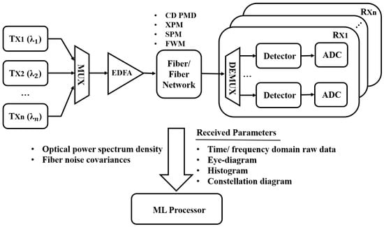 Typical application of ML models for MFI and OPM in short-reach optical systems and networks; MUX: multiplexer; EDFA: erbium-doped fiber amplifier; ADC: analog to digital converter XPM: cross-phase modulation; FWM: four-wave mixing; SPM: self-phase modulation.