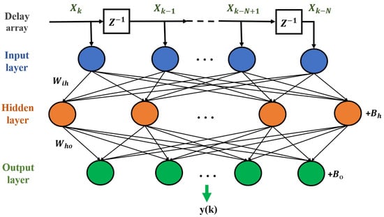 where is the input signal sequence, is the weight matrix between the input layer and the hidden layer, is the weight matrix between the hidden layer and the output layer, and are the bias metrics of hidden layer and output layer, and f is the activation nonlinear function of the hidden layer.