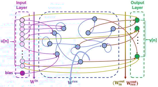 Because it resembles nonlinear dynamical systems, the hidden layer is called a reservoir. The inputs are injected into the reservoir via the linear transformation and they drive the reservoir states , which are characterized by the recurrent interconnections within the reservoir and output interconnections [82,116]. Therefore, the reservoir states can be expressed as: