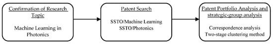 More studies are starting to focus on the development of machine learning in photonics [7,8]. However, these studies have focused on algorithm technologies [2,9,10,11] or specific applications [1,3,6,11,12,13], such as machine learning-based optical data decoding [2], machine learning techniques for computing various optical properties [1], and a fully optical neural network that increases the computational speed and power efficiency of state-of-the-art electronics for conventional inference tasks [6]. Some studies have examined the developmental potential of machine learning in photonics [14,15,16,17]. They did not study the topic from a macro perspective or indicate the individual positioning of technology distribution and technology developers of machine learning in photonics. Specifically, no study has examined technological fields that employ the synergy between machine learning and photonics and the technological advantages of various assignees. Accordingly, this study investigated these topics through patent portfolio analysis.