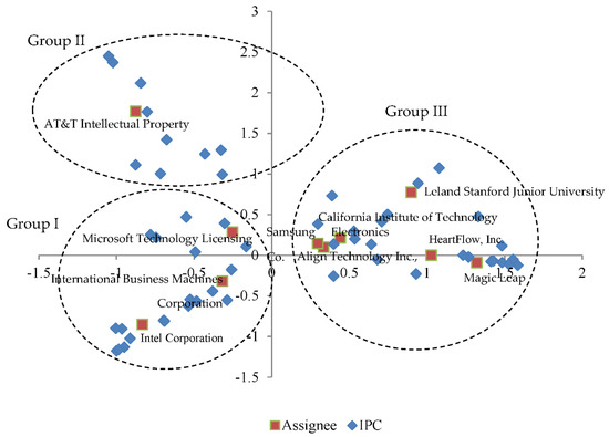 This study used correspondence analysis to perform patent portfolio positioning analysis. Past scholars have used correspondence analysis to study the distribution of ecosystems [32], brand positioning [33], applications of medical management [34], and innovation management strategies [35]. This study used assignees and IPC numbers as categorical variables and selected data of the top ten assignees in machine learning in photonics patents; these patents were distributed over 77 classes of the three-level IPC patents and are related to diverse technological fields.