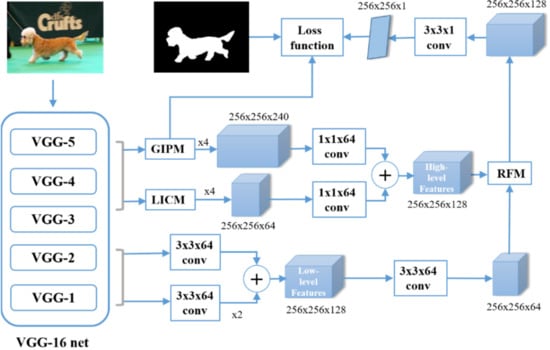 The overall architecture based on dual-branch feature fusion and VGG-16 backbone. Because of the strong ability to combine multi-level features from classification networks, this type of architecture has been widely adopted in many vision tasks, including salient object detection. As shown in Figure 1, low-level features are concatenated from VGG-1 and VGG-2 (Branch 1). By extracting the global and local information from LICM and GIPM (Branch 2), we aim at completely distinguishing the salient objects from the background. After that, we further introduce a refinement fusion module (RFM) to ensure that high-level and low-level features from different layers can be adaptively merged together. In what follows, we describe the structures of the above mentioned three modules and explain their functions in detail.