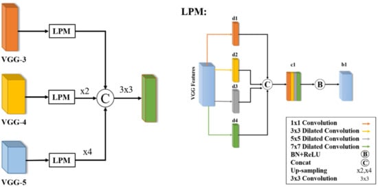 Specifically, the local information concatenation module is shown in Figure 2. High-level features separately extracted from VGG-3, VGG-4 and VGG-5 layers. These features at different scales then fed into LPM. In LPM, we adopt dilated convolution with different dilation rates, which are set to 3, 5 and 7 to capture multi-receptive-field local information. Moreover, we combine the feature maps from different dilated convolutional layers and a 1 × 1 convolutional feature by channel concatenation. After batch normalization and activation, we obtain features with multi-receptive-field local information in single scale. Finally, we up-sample the LPM outputs corresponding to VGG-4 and VGG-5 and combine them with the VGG-3 branch by channel concatenation.