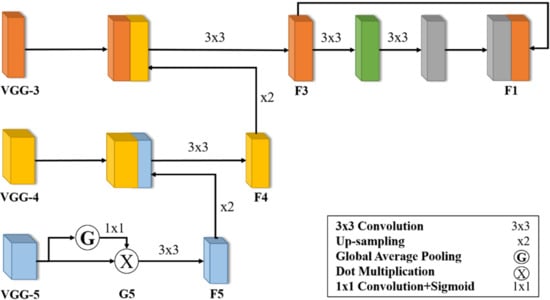 To overcome these issues, we designed the GIPM module to capture the global information from deep features and transmit global information layer by layer. As shown in Figure 3, we firstly employ global average pooling to obtain the global information and then reassign different weights to different channels of the VGG-5 feature maps (G5) by 1 × 1 convolution and sigmoid function. Finally, we fed G5 into a three-layer U-Net structure. The feature maps (F3) fed into a two-layer convolutional skip link became the final GIPM outputs (F1).