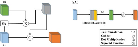 Detailed illustration of the refinement fusion module (RFM). In order to better integrate the high-level (H1) and low-level (L1) features, we introduced a spatial attention (SA) mechanism. By focusing on the spatial attention of the high-level features, we reduced the cluttered background influence in the low-level features.