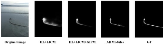 In addition, we visualized the combined effects of different modules. As shown in Figure 6, the network can output an optimal saliency map by adding global information and low-level supplement information.