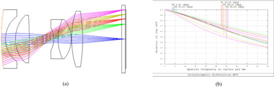 The wide-field optical system has a 28-degree field of view, and the focal length of the system is 15 mm. The image size and pixel size of the wide-field optical system are 2000 × 2000 and 5.5 μm × 5.5 μm, respectively. The optical structure is shown in Figure 7a.