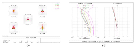 Figure 8 shows the wide-field optical system spot diagram together with field curvature and distortion. The point diagram in Figure 8a indicates that wide-field optical system has excellent imaging effects in the visible light band. The RMS radius corresponding to the maximum angle of view is only 4.877 μm. As shown in Figure 8b, the maximum field curvature and distortion produced by the wide-field optical system are only 0.14 mm and 2%, respectively.