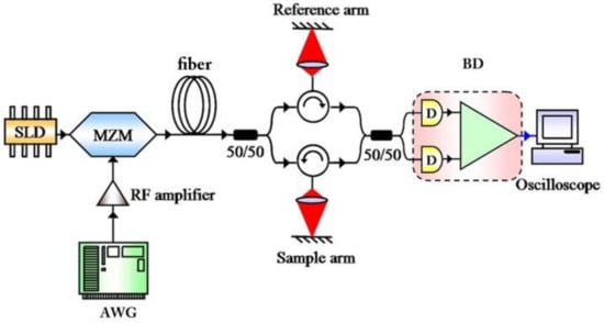 Optical design of the OC2T. SLD: super luminescent diode, MZM: Mach–Zehnder modulator, AWG: arbitrary waveform generator, RF: radio frequency, BD: balanced detector.