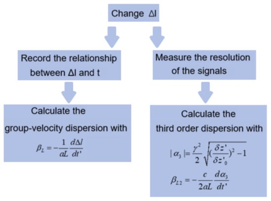 The flow chart is shown in Figure 2. The fiber under test is placed after MZM. We then change the optical path difference between the reference arm and sample arm Δl and record the signal position t′ and resolution δz′. Finally, we can calculate the group-velocity dispersion and third order dispersion by Equations (8) and (11).