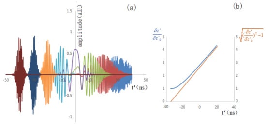 The simulation result using the parameter of 10 km SMF. (a) The signal at different t′, colors from left to right are used for signals at t′ = −40, −30, −20, −10, 0, 10, 20, 30 ns, respectively; (b) the relationship between the resolution expansion and t′.