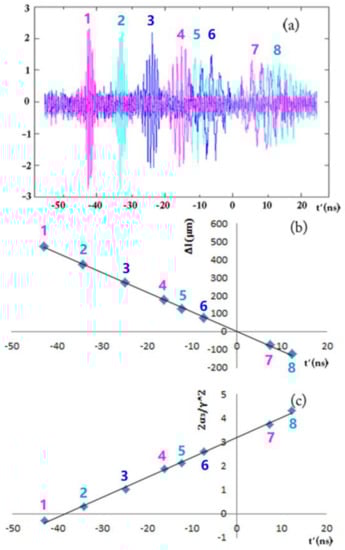 Figure 4 shows the experiment result, where we measured the signal at different t′ by changing the optical path difference Δl. In Figure 4a, we can see that the position and the width of the signal are changing with the optical path difference Δl. In Figure 4b,c, we prove experimentally that the optical path difference Δl and α3 are linear with t′, which is in consistent with the theoretical results. We find the relationship between Δl and t′ in Figure 4b and calculate the slope d(Δl)/dt′ = −(10.9 ± 0.6) μm/ns. The group-velocity dispersion can be deduced from Equation (7):