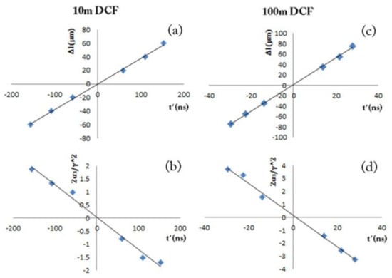 The measurement of the dispersion of 10 m and 100 m DCF. (a) The relationship between the optical path difference Δl and t′ of 10 m DCF, the linearity between Δl and t′ is 0.999; (b) the relationship between the resolution expansion and t′ of 10 m DCF, the linearity between α3 and t′ is 0.99. (c) The relationship between the optical path difference Δl and t′ of 100 m DCF, the linearity between Δl and t′ is 0.999; (d)the relationship between the resolution expansion and t′ of 100 m DCF, the linearity between α3 and t′ is 0.99.
