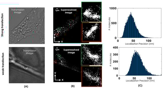 (A) Transmission image of the transfected cells chosen for study. (B) Reconstructed super-resolved images of a single NIH3T3 cell along with transmission images and enlarged clusters (red and green regions). (C) The localization plot of resolved single molecules for strong and weak transfected cell that show an average localization precision of 45 nm and 55 nm, respectively.
