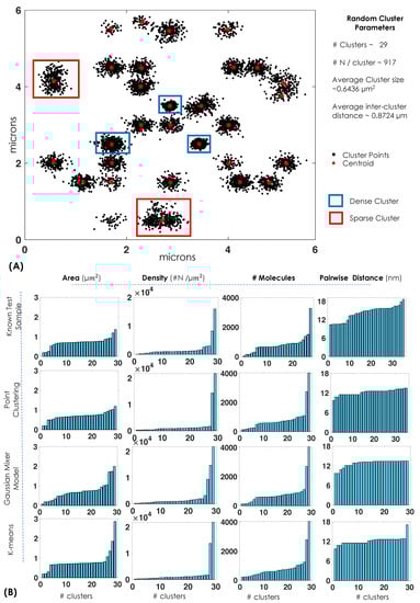 To determine the performance of single-molecule clustering method, we computationally generated random clusters with known parameters such as number of clusters, number of molecules per cluster, and inter-cluster distance. The generation of test data (random clusters) is discussed in Supplementary S3. Subsequently, three different clustering methods (point-clustering, Gaussian mixture, and K-means) were employed for analysing clusters. The first method is point-clustering that uses Euclidean distance () to identify the next point in the cluster and, depending on the distance cut-off, determines if the point belongs to the cluster [50,51]. We chose nm as the cut-off and minimum number of points to be greater than 200 for it to be considered as a valid cluster. This technique has the distinct advantage of leaving out un-clustered points. This is consistent with the observation that not all molecules in real biological sample form clusters. The second method is based on Gaussian mixture that requires the identification of each cluster (i) by fitting a Gaussian function, , where, and are, respectively, the mean and standard deviation of the Gaussian function [52]. Often, expectation maximization based iterations are carried out for convergence to a stable solution [53,54,55,56]. Due to iterative nature of the Gaussian mixture method, the technique benefits from the feedback mechanism and converges to the most likely solution. The third promising method is K-means in which cluster centroids/means are randomly placed and each point is assigned to the nearest mean based on the least-squared Euclidean distance, , where is the Euclidean distance between and the centroid, (calculated using k-means++ algorithm in Matlab) [57,58]. Iteratively, the centroid for each cluster () is recalculated until convergence. Finally, the simulated data are subjected to cluster-analysis algorithms. The details of algorithms and data processing are detailed in Supplementary S2.