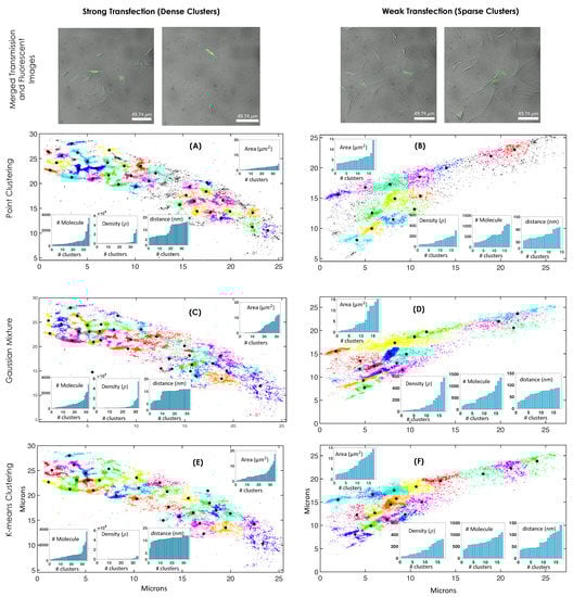 (A–F) Top row shows merged images (fluorescent and transmission images) of strong and weak transfected cells. Cluster analysis for two chosen single cells from an ensemble of Dendra-2HA transfected NIH3T3 cell. Both strongly and weakly transfected cells are considered, which show dense and weak molecular clusters, respectively. Three different clustering methods (point clustering, Guassian mixture model, and k-means clustering) were employed to determine biophysical parameters (cluster area, cluster density, number of molecules per cluster, and pairwise-distance ). The colors are used to discern clusters.