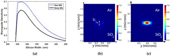 A DC with a gap GDC of 100 nm and a length LDC of 12.1 µm was designed using 3D-FDTD to work as a 3 dB coupler at 1.55 µm. Next, we optimized the slot waveguide with a 100 nm slot gap width Gslot such that we maximized the waveguide sensitivity Swg. Swg was determined at λ = 1.55 µm using the FDE solver and Equation (5). A change in the air cladding medium index Δnmed of 0.001 was introduced and the corresponding change in the mode effective index Δneff was calculated using the FDE solver from which the Swg value was determined with Equation (5). Figure 2a shows the Swg of the quasi-transverse electric (TE) mode for both the slot and strip waveguide versus the silicon waveguide width. The results show that there is an optimum width for both waveguides that maximizes Swg. This is expected because, at small silicon widths a significant part of the evanescent field is confined in the substrate, resulting in a low Swg, while for large silicon widths most of the field will be confined inside the silicon. Hence, there is an optimum width where the field in the cladding is maximized. According to the results shown in Figure 2a, we chose the silicon width of the slot waveguide to be Wslot = 270 nm, which gave the highest Swg value of 0.7. On the other hand, wide strip waveguides allow for better confinement, and hence lower sensitivity, and lower propagation and bend loss. Therefore, we chose Wstrip = 500 nm, which was the largest possible waveguide width, while maintaining single-mode operation, resulting in an Swg as low as 0.1. For this design, there is no need for capped oxide deposition and subsequent lithography and etching of a sensing area.