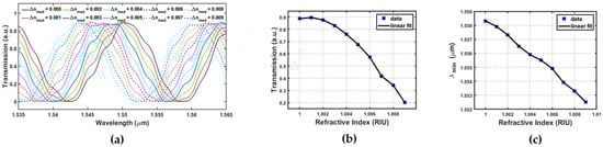 There are two main sensing schemes for the determination of the refractive index of the sensing medium: intensity interrogation and wavelength interrogation. In the intensity interrogation scheme, the medium’s refractive index is determined by the change in the output intensity (transmission) at a specific wavelength (see Figure 4a). Figure 4b depicts the change in the output transmission at λ = 1.55 µm due to the change in the refractive index of the medium for our LT-MZI sensor with L = 50 µm. In the wavelength interrogation scheme, the medium’s refractive index is determined by the shift in the resonance wavelength dλres (see Figure 4a). Figure 4c shows the shift in the resonance wavelength due to the change in the refractive index of the medium for our LT-MZI sensor with L = 50 µm.