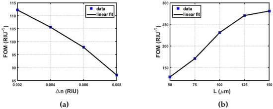 (a) LT-MZI sensor FOM calculated at different medium index changes (Δn) with L = 50 μm; (b) LT-MZI sensor FOM versus interferometer arm length.