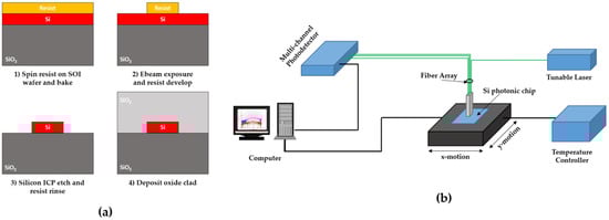 The fabrication of the structures was achieved using a multi-project wafer (MPW) on a 200 mm SOI wafer with a 220 nm silicon device layer at the University of Washington Nanofabrication Facility [57], using electron beam lithography (EBL). Figure 6a shows the waveguide fabrication steps. EBL with a negative resist and inductively coupled plasma (ICP) etching (using chlorine gas) were used for silicon patterning. Then, plasma-enhanced chemical vapor deposition (PECVD) was used to deposit around 2 µm of oxide cladding. The device characterization was performed by the MiNa group at the University of British Columbia [58] and at Maple Leaf Photonics [59]. The measurement setup, shown in Figure 6b, included a tunable laser from 1500 nm to 1600 nm wavelength, a polarization-maintaining fiber array with four fibers for the i/o optical signal, and a multi-channel photodetector. Grating couplers on each device on the chip were used to couple the optical signal from/to the fiber array. The chip was placed on an automated stage with 2D movement. The stage was linked to a computer with software that automated the measurements by controlling the movement of the stage using the GDS file of the chip to trace and measure the different optical devices on the chip. A temperature controller was also used to adjust the temperature of the stage. Using this setup, the transmission spectra of the different devices could be measured in a fast and accurate manner.