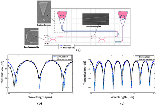 The layout of the fabricated LT-MZI and SEM images of its various components are shown in Figure 7a. The measured transmission spectra of the LT-MZIs with L = 50 µm and L = 150 µm are shown in Figure 7b,c, respectively, along with the corresponding INTERCONNECT simulation results. It can be seen that there is a good match in the device response between the simulation and the measurement results. The FSR calculated from the measurements was 11.24 nm and 4.19 nm with 1.1% and 2.18% deviation from the simulation results for the 50 µm and 150 µm devices, respectively. These results further ensured that the numerical simulation results we obtained previously could be trusted.
