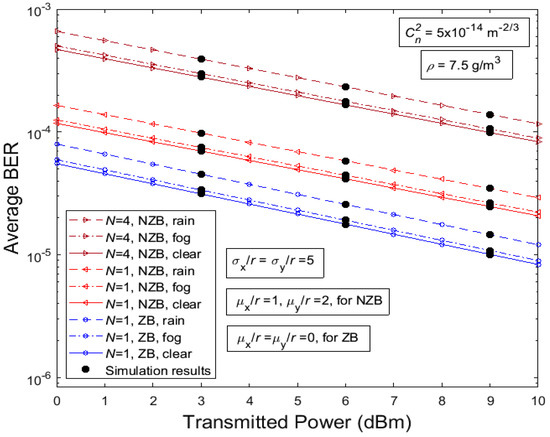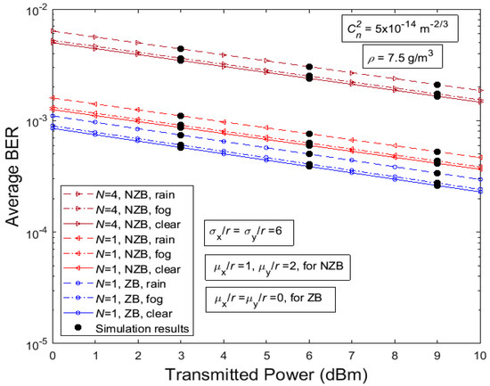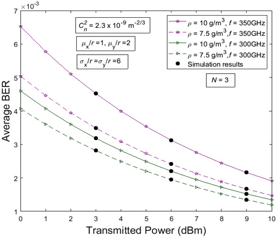 Figure 1 illustrates the ABER evolution for single-hop or the quad-hop LOS THz link configuration over a wide range of transmitted power through a weak turbulent channel with clear, rain or fog weather conditions and moderate air humidity along with the presence of FSPL and strong ZB or NZB pointing errors. It is depicted that for the same transmitted power and water vapor concentration values along with identical turbulence conditions, the weather effects and NZB pointing errors, the single-hop outperforms the quad-hop link configuration in terms of ABER. This is in accordance with other multi-hop configurations in the wider outdoor wireless communications literature [22,23,55], while it can be explained by the fact that most of the effects that affect the THz ABER performance such as FSPL, water vapor attenuation and atmospheric turbulence are distance-dependent. Thus, quadrupling the total THz coverage area becomes at the expense of this ABER performance degradation. Additionally, by focusing on single-hop configuration’s ABER results, we can observe that higher corresponding ABER values are obtained when NZB pointing errors are considered instead of ZB pointing errors with the same spatial jitter. The latter indicates that as is the case with FSOs [2,28,67], the boresight component should not be neglected when stochastic pointing errors are estimated between THz transmitter and receiver terminals. Consequently, our initiative to include NZB pointing errors for THz links alike seems to be reasonable. Furthermore, for each illustrated configuration, i.e., single-hop with ZB pointing errors, single-hop with NZB pointing errors and quad-hop with NZB pointing errors, three different weather scenarios are depicted, i.e., fog, rain or clear weather conditions. The performance comparison between them reveals that corresponding ABER values under rain are the largest. Likewise, ABER values under fog are slightly larger than their corresponding ABER values under clear weather conditions. This behavior indicates that rain is the most detrimental weather effect for THz signal transmissions while fog slightly aggravates the attenuation of the propagating THz signal. It is worth noting that the latter is qualitatively consistent with the experimental findings in [11,12,15,16,17]. It should be also recalled here that contrary to THz, the most detrimental weather effect for FSO transmissions is fog due to the comparable size of fog droplets with IR optical wavelengths [12,78], while conversely, FSO transmissions suffer only slightly from rain. This fact enables THz as a key complementary wireless technology to FSOs, paving the way for the development of hybrid FSO/THz links which will be able to efficiently operate in both rain and fog conditions. Finally, it is shown that higher transmitted power values lead to lower ABER values, as it was expected.
