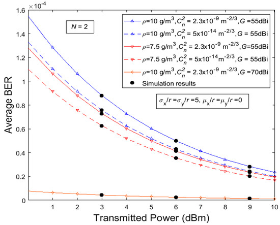 In this section, proper analytical results obtained by the derived closed-form expressions are presented. These results mainly aim to reveal the individual impact of each of the above-mentioned major impairments as well as their joint influence on the total ABER and the coverage area of a typical THz system which may employ multiple hops. In more detail, the THz system under investigation may consist of hops. Each of the hops are assumed to have the same, equal to , link length. The refractive index structure parameter is assumed to be m−2/3 for weak or m−2/3 or strong turbulence, similarly to the experimental measurements in [14]. Additionally, the system may operate with frequency equal to or , while in terms of the antenna characteristics, they have either aperture radius with gain or aperture radius with gain [19]. Note that unless otherwise stated, the and with gain transmitter and receiver pair is utilized in the following figures and results. Such transceiver antennas can practically support up to several hundreds of meters propagation distances which is consistent with the THz hop length of the investigated system. Specifically, the selected antenna gain can be practically achieved by employing high-gain Cassegrain antennas which are commonly used in the THz frequency regime of the selected central frequency [27], while the antennas are also already manufactured and tested with success [77]. Consequently, we have selected the above operation frequency values for the examined link because they are appropriate for the operation of the practically applicable transmitter and receiver antenna terminals mentioned above, while they also are within the proper frequency regime in which Equation (6) is valid. In terms of the stochastic influence of the generalized pointing errors, different practical boresight and jitter component values have been assumed for each hop transmission, i.e., 9 with or for weak-to-strong ZB pointing errors and or for weak-to-strong NZB pointing errors, respectively [69]. Furthermore, it is assumed that in accordance with the practical channel and environmental circumstances, the surface temperature is equal to , the air pressure is equal to , while or for moderate-to-strong molecular attenuation due to water vapor along each THz hop, respectively [19,27,60]. Regarding the impact of weather effects, with the exception of a clear sky along the THz channel, two different and realistic scenarios are examined. More precisely, the impact of fog attenuation is determined by an additional attenuation factor , while rain attenuation is determined, in turn, by an additional attenuation factor at a precipitation rate of [5,34], (Figure 1). It is worth noting that unless otherwise stated, clear weather conditions are assumed and OOK modulation is utilized. Finally, σn = in all link configurations [19,41], while Monte Carlo simulations are marked below with solid dots, which have been generated by Matlab software for values lower than 10−6. In this way, we further validate the corresponding analytical results obtained.