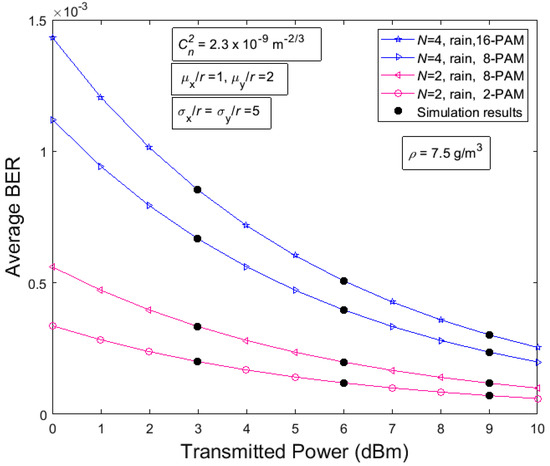 It is worth mentioning that the analysis performed above can be extended to accommodate more complex modulation formants. An example is theL-symbol Pulse Amplitude Modulation (L-PAM) modulation format which has been proved to achieve spectral efficiency enhancements in the wider wireless communications field in comparison to OOK [74,75,76]. According to L-PAM, the information is encoded into L different amplitudes, which represent the L different symbols. Thus, considering in Equation (1) that is the corresponding L-PAM symbol amplitude, the instantaneous BER for the L-PAM signaling technique can be, correspondingly to Equation (19), obtained as described in [76]