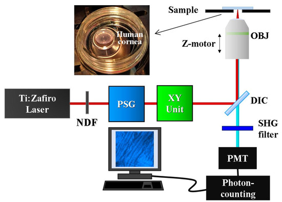 Measurements were performed using a custom SHG microscope (Figure 1). This setup consists of an 800 nm femtosecond laser (Mira900; Coherent, Santa Clara, CA), an inverted microscope (Nikon TE2000-U; Nikon Corporation, Tokyo, Japan), a galvanometric scanner (XY unit) and a long-working-distance 40× NA 0.5 non-immersion objective (OBJ, Nikon ELWD Series; Nikon Corporation, Tokyo, Japan). A telescopic system (not shown) conjugates the XY unit and the entrance pupil of the OBJ.
